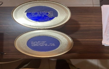 Physical examination of the product confirmed that the dates printed on the top sticker did not match the original markings underneath. This discrepancy indicated that the product had been revalidated and tampered with without proper regulatory approval.