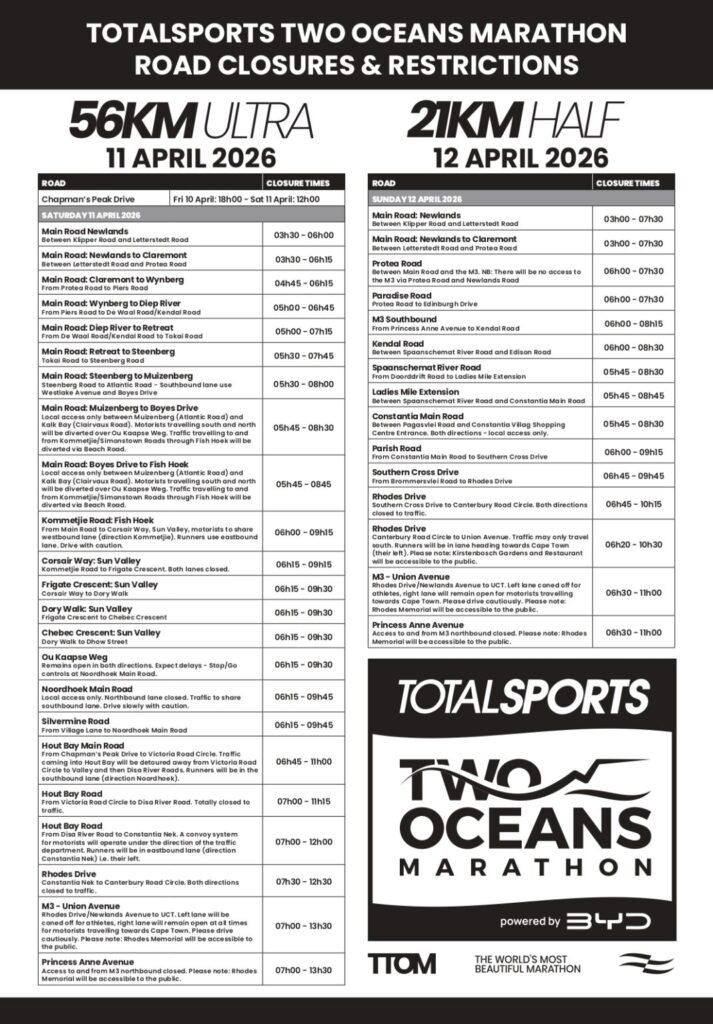 Authorities in Cape Town have issued a major travel advisory ahead of the Two Oceans Marathon road closures, as thousands of runners prepare for one of South Africa’s most iconic sporting events this weekend.